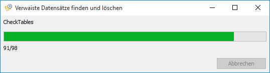 - Der Prozess „Verwaiste Datensätze finden und löschen“ optimiert die Datenbank beim ersten Programmstart und bereinigt diese um „Altdaten“, welche nicht mehr den Normen eines relationalen Datenbankmodells entsprechen
