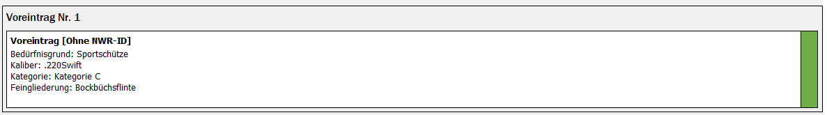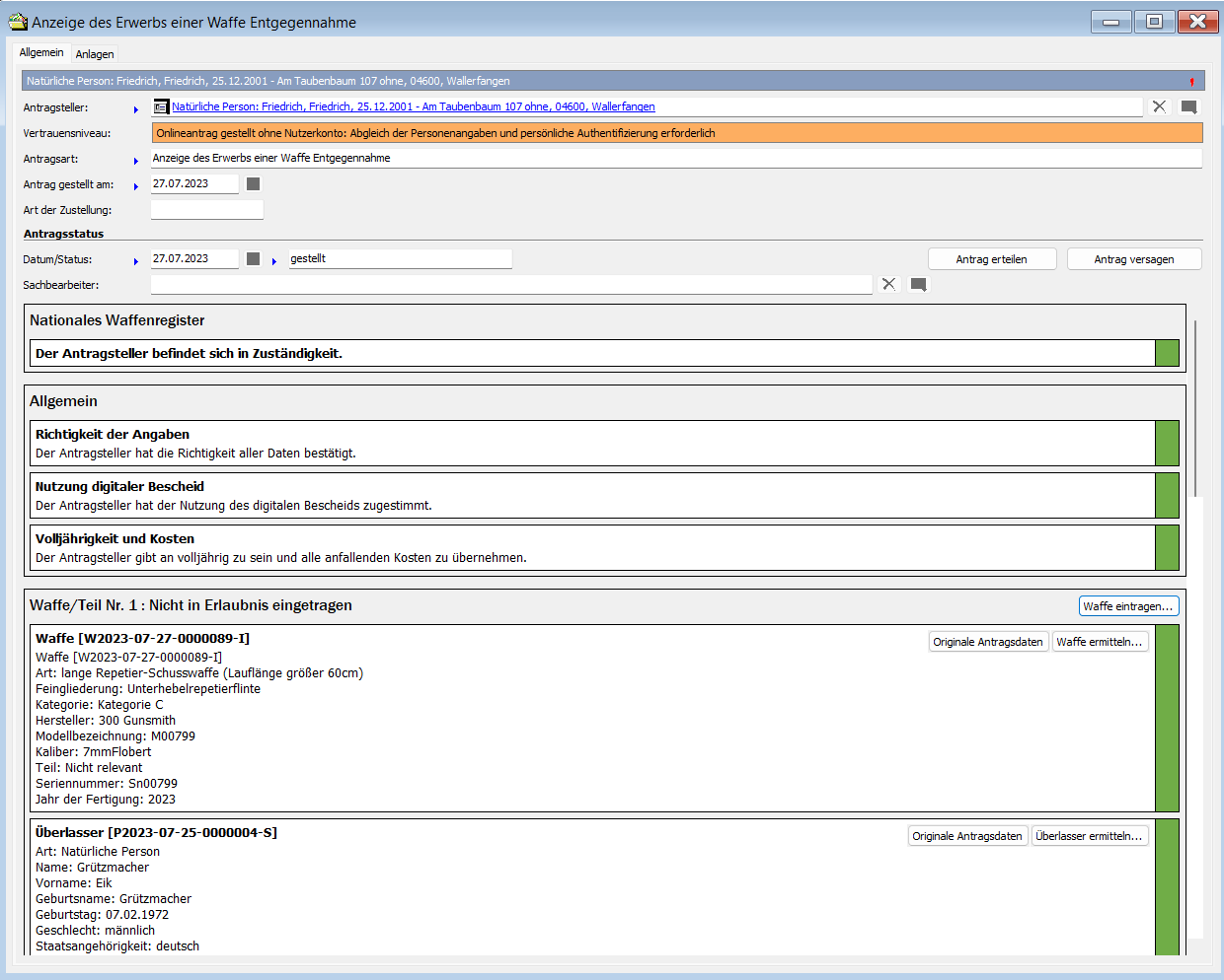 Wird ein Antrag bspw. inkl. aller notwendigen NWR-IDs an die Waffenbehörde übermittelt, löst das Antragsmodul die Personen-, Erlaubnis- und Waffendaten mit Hilfe einer NWR-Datenverbindung auf und stellt sie mit allen für die Antragserteilung wichtigen Details in der Antragsmaske dar.