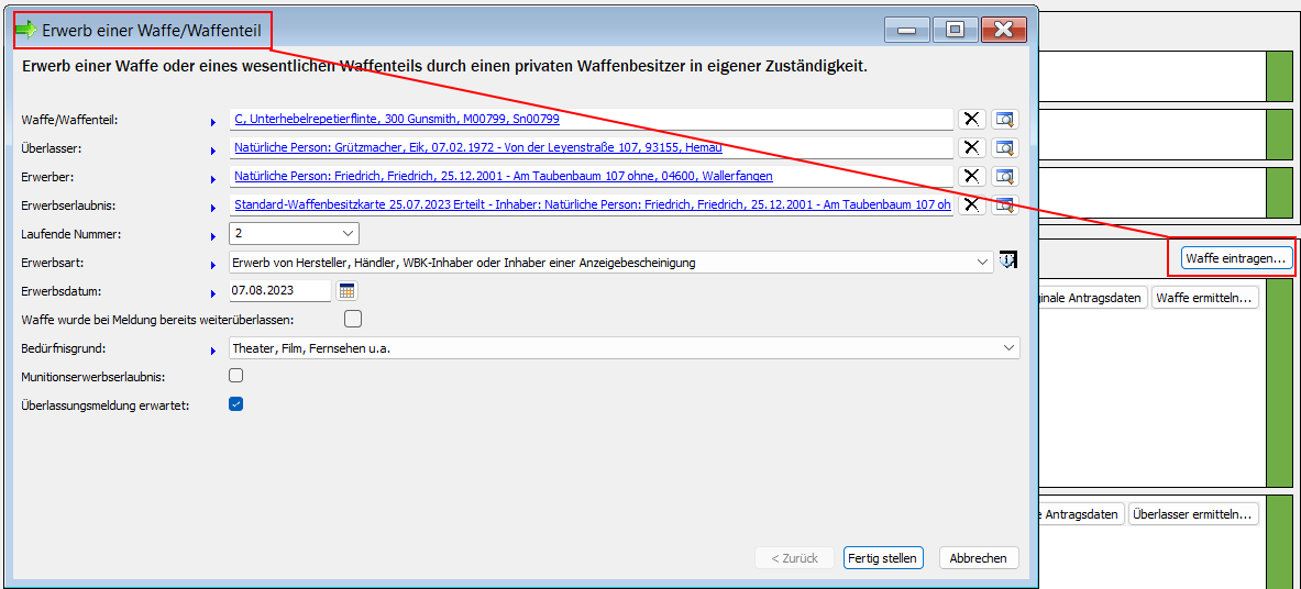 Die beiden im Waffenrecht besonders relevanten Strecken zur Meldung eines Waffenerwerbs bzw. einer Waffenüberlassung wurden mit der vorliegenden WorkOffice Version 8.11.126 zur prozessbasierten Nutzung freigeschaltet.