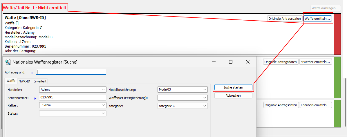 Liegt dem Antragssteller z.B. die Waffen-NWR-ID einmal nicht vor, können unvollständige/als Freitext hinterlegte Antragsdaten in der Waffenverwaltung nachträglich im NWR/lokal ermittelt werden.