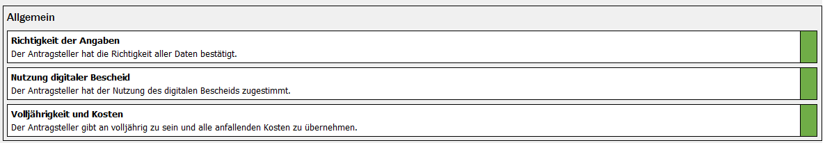 Betroffene Antragsmasken wurden um den Bereich "Allgemein" erweitert, welcher die vom Antragsteller zu tätigen Angaben hinsichtlich der Einverständniserklärung einer DSGVO-konformen Verarbeitung seiner Daten sowie den mit der Antragstellung anfallenden Kosten darstellt.
