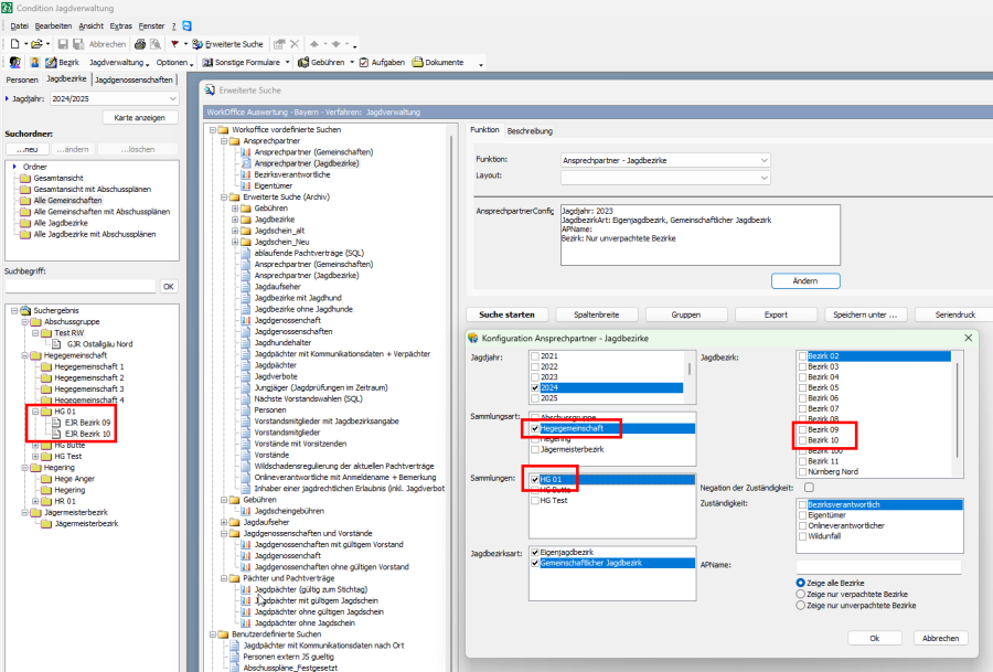 - Innerhalb der erweiterten Suche „Ansprechpartner Jagdbezirke" werden nun die benötigten Jagdbezirke wieder aktiviert, sobald eine Sammlungsart ausgewählt wurde.