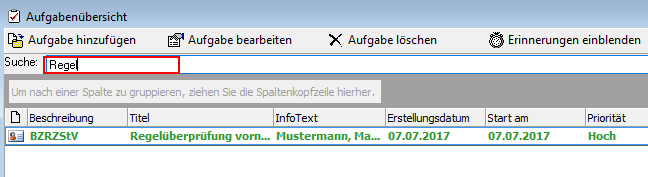 Ein schnelles Auffinden von Aufgaben anhand von Schlagwörtern ermöglicht Ihnen die im oberen Bereich der Maske „Aufgaben verwalten“ befindliche „Suche“. Sobald Sie innerhalb dieses Eingabefeldes eine Zeichenfolge eintragen und diese durch Drücken der Enter-Taste bestätigen, reduziert sich der Inhalt der Aufgabentabelle automatisch. Die Daten können sich z.B. im Titel, in der Beschreibung oder in einem Datumsfeld befinden.