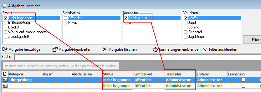 Die gesetzten Filter werden nach dem Schließen der Aufgabenmaske pro Benutzer gespeichert, so dass die Anzeige beim nächsten Öffnen z.B. nur auf die Ihren Sachbearbeiter betreffenden Aufgaben reduziert wird.