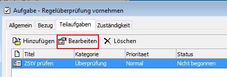 Um eine Teilaufgabe zu bearbeiten, z. B. den Status zu editieren, können Sie diese über die übergeordnete Hauptaufgabe öffnen. Hierzu markieren Sie den gewünschten Eintrag im Bereich „Teilaufgabe“ und klicken anschließend auf die Schaltfläche [Bearbeiten].