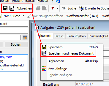 Nehmen Sie alle gewünschten Änderungen in der Eingabemaske vor und speichern Sie die Daten, indem Sie mit der rechten Maustaste erneut in die Bildschirmmaske klicken und den Menüpunkt „Speichern“ auswählen. Wenn Sie die Aktion verwerfen und zur Hauptaufgabe zurückkehren möchten, klicken Sie auf die Option [Abbrechen]. Die Optionen [Speichern] und [Abbrechen] stehen ihnen auch als alternative Schaltfläche in der oberen Menüleiste zur Verfügung.