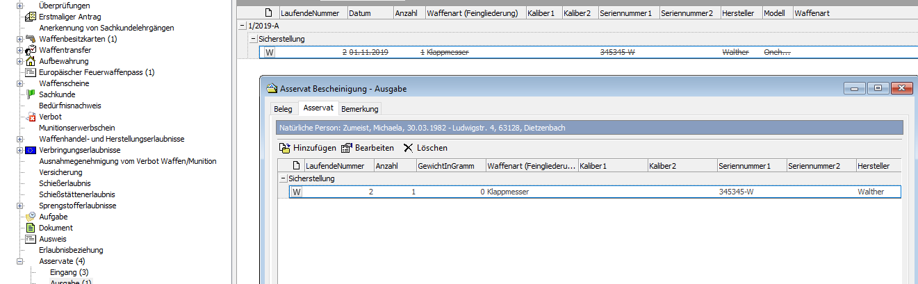 Um ein Asservat in Ihrem Bestand auszubuchen, muss der Personennavigator einer Person aufgerufen werden, welche die Waffe von der zuständigen Waffenbehörde entgegennimmt. Handelt es sich bei der entgegennehmenden Person z.B. um eine externe zur Vernichtung einer Waffe autorisierten Stellen, muss zuerst ein Datensatz der annehmenden Person/Behörde/Firma in der Condition Waffenverwaltung angelegt werden.