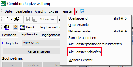 Zum Archivieren eines Jagdbezirks muss der Jagdbezirksnavigator zuvor geschlossen werden. Alternativ können alle derzeit geöffneten Fenster über den Menüpunkt „Fenster – Alle Fenster schießen“ gleichzeitig geschlossen werden.