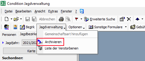 - Klicken Sie in der oberen Menüleiste auf den Button [Jagdverwaltung] und wählen Sie hier Archivieren aus dem Untermenü.