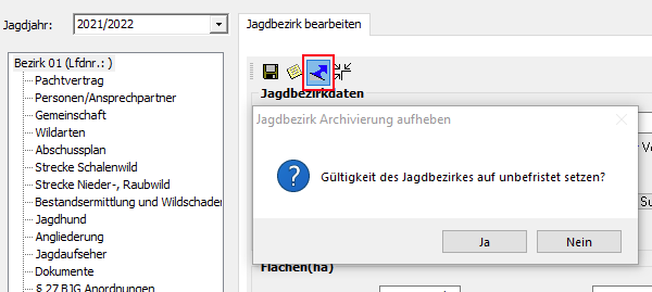 Es öffnet sich der Jagdbezirksnavigator. Hier klicken Sie im rechten Maskenbereich auf die Schaltfläche [Archivierung aufheben] und bestätigen die Hinweismeldung „Gültigkeit auf unbefristet setzen“ mit [Ja].
