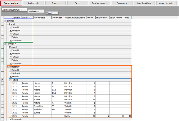 - Auf dem Screenshot in grün dargestellt: Die Gesamtsumme aller Jagdbezirke zur Gruppe (Hegering, Abschussgruppe etc.)