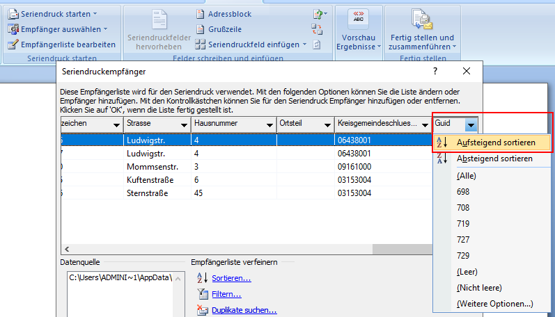 Suchen Sie aus genanntem Grund bitte in der Empfängerliste nach dem Feld "Guid" und sortieren Sie die enthaltenen Daten "aufsteigend" nach diesem Datenfeld.