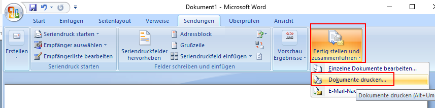 Um den Seriendruck über Word auszulösen, klicken Sie auf [Fertig stellen und zusammenführen] und wählen hier "Dokumente drucken".