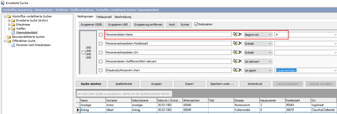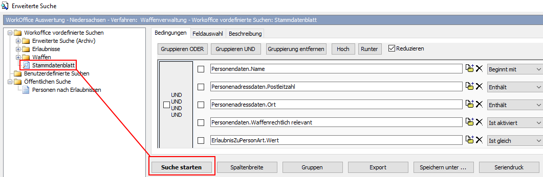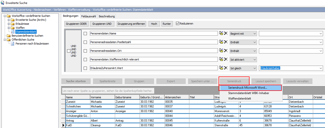 Um die Seriendruckfunktion verwenden zu können, öffnen Sie bitte zunächst die [Erweiterte Suche] der Condition Waffenverwaltung.
