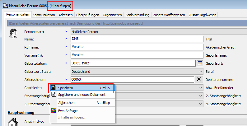 Wenn Sie nun eine neue Person in Condition WorkOffice erfassen und die "Speichern"-Funktion auslösen,