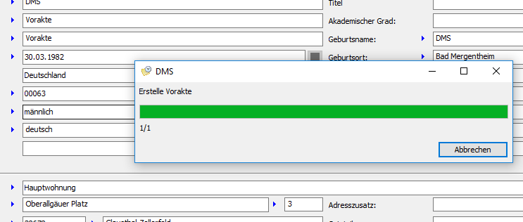 wird durch die Fortschrittsanzeige "Erstelle Vorakte" dargestellt, dass die Akte zur Person im zentralen DMS angelegt wird.