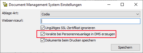 Um diese Speichermethode zu aktivieren, öffnen Sie bitte zuerst die DMS-Einstellungen über die "WorkOffice Administration". Markieren Sie in dieser Maske das Häkchen "Vorakte bei Personenneuanlage in DMS erzeugen" (wenn für Ihr DMS verfügbar) und klicken Sie auf [Speichern].