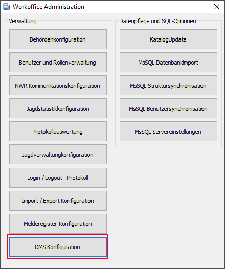 Um das bei Ihnen eingesetzte DMS System einzustellen, öffnen Sie bitte die "WorkOffice Administration" und klicken Sie hier auf die Schaltfläche [DMS Konfiguration].