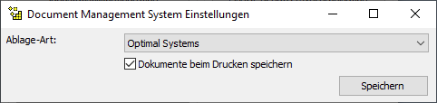 Wählen Sie bitte bei „Ablage-Art“ den Ihrem behördenweit eingesetzten DMS entsprechenden Eintrag aus, in unserem Beispiel „Optimal Systems“. Das Ablageverzeichnis bleibt in diesem Fall leer und wird vom übergeordneten DMS gesteuert. Neben der Anbindung an die DMS-Schnittstelle von Optimal Systems (Enaio) stehen des Weiteren Module für die Programme von „Codia“, „OTS", „komXwork" und "docuware" bereit. Die notwendigen Installations- und dll-Dateien fordern Sie bitte direkt bei Ihrem DMS Anbieter an.