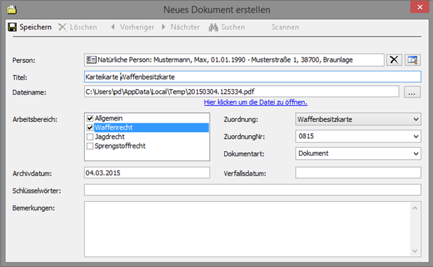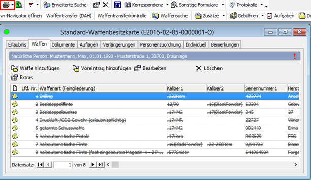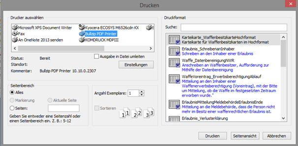 Im nachfolgenden Beispiel wird die Karteikarte zu einer Waffenbesitzkarte gedruckt und im Dokumentenmanagementsystem gespeichert: