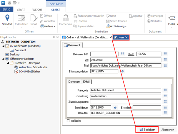Im Kontext der gesuchten Person können Sie bspw. über einen Rechtsklick ein neues Dokument in Enaio erzeugen. Vergeben Sie hier die notwendigen Informationen wie den „Titel“ usw. und klicken Sie abschließend auf [Speichern]. In den darauf folgenden Schritten übernehmen Sie ein vorhandenes Dokument über die „Importieren“ oder „Scannen“-Funktion und speichern dieses ebenfalls ab.