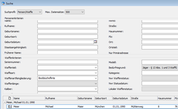 Sie möchten alle „Bockbüchsflinten“ die mit dem Bedürfnisgrund „Jäger - §13“ ausgestellt wurden aus Ihrem Datenbestand herausfiltern.