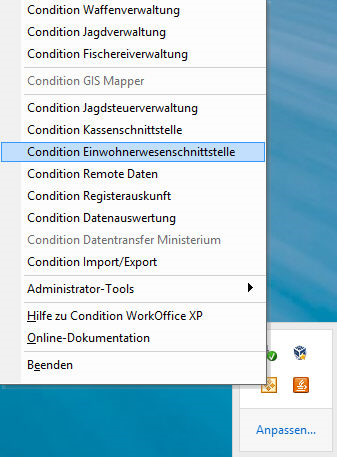 Um die Einwohnerwesenschnittstelle aufzurufen, klicken Sie den unten rechts in der Windows-Taskleiste befindlichen "WorkOffice Schnellstartwürfel" mit der linken Maustaste an und wählen dann den Optionspunkt "Condition Einwohnerwesenschnittstelle" aus. Alternativ verwenden Sie den unter "Start -> Programme -> Condition WorkOffice XP" befindlichen Eintrag.