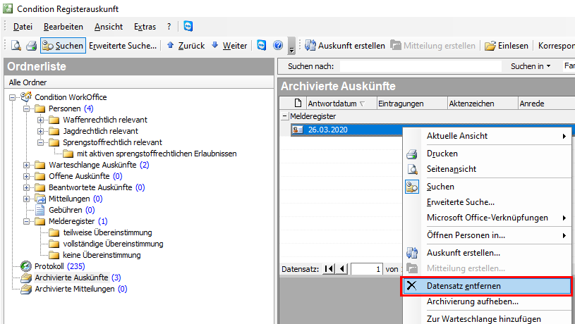 Melderegisterabfragen, bei denen die Bearbeitung abgeschlossen wurde, sollten über die Funktion „Auskunft archivieren“ in den Ordner „Archivierte Auskünfte“ verschoben werden. Um einen Datensatz zu archivieren, klicken Sie diesen mit der rechten Maustaste an und wählen „Auskunft archivieren“.