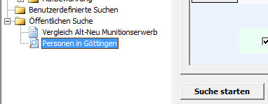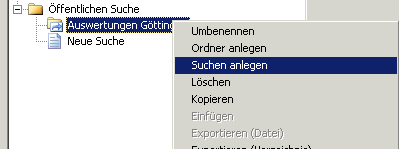 In der EWS können auch leere Suchen in den Ordnern „Benutzerdefinierte Suchen“ und „Öffentliche Suche“ erzeugt werden. Die leeren Suchen können dann Ihren Vorstellungen nach um Tabellenverknüpfungen, Felder und Suchkriterien ergänzt werden. Hierzu klicken Sie mit der rechten Maustaste auf einen der Hauptordner und wählen aus dem Untermenü „Suche anlegen“ aus.