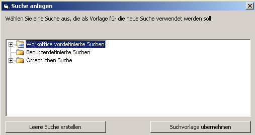 Das Fenster "Suche anlegen" bietet Ihnen anschließend die Möglichkeit, die zuvor beschriebene, leere Suche in der EWS zu erzeugen oder alternativ eine neue Suche aus einer Suchvorlage zu erstellen. Klicken Sie auf die für Ihren Zweck geeignete Schaltfläche.