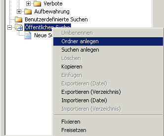 Sie können in der EWS auch Ihre eigene Ordnerstruktur anlegen. Diese Möglichkeit besteht jedoch nur in den Ordnern „Benutzerdefinierte Suchen“ und „Öffentliche Suche“. Hierzu klicken sie einfach mit der rechten Maustaste auf einen der Hauptordner und wählen aus dem Untermenü „Ordner anlegen“ aus.