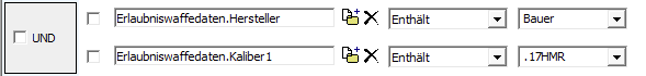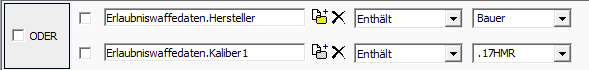 Es werden alle Waffen angezeigt welche als Hersteller den Wert „Bauer“ enthalten UND das Kaliber „.17HMR“. Sollte ein Datensatz nun den Hersteller „Bauer“ haben aber ein anderes Kaliber wird diese nicht angezeigt.