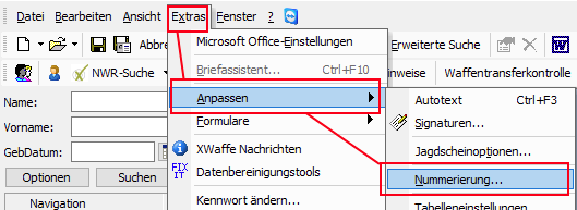 - Klicken Sie in der oberen Menüleiste der Waffen- oder Jagdverwaltung auf "Extras - Anpassen - Nummerierung".
