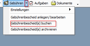 - Öffnen Sie über den rechten kleinen Pfeil des Buttons „Gebühren“ im darauffolgenden Menü die Option „Gebührenbescheide buchen“ aus.