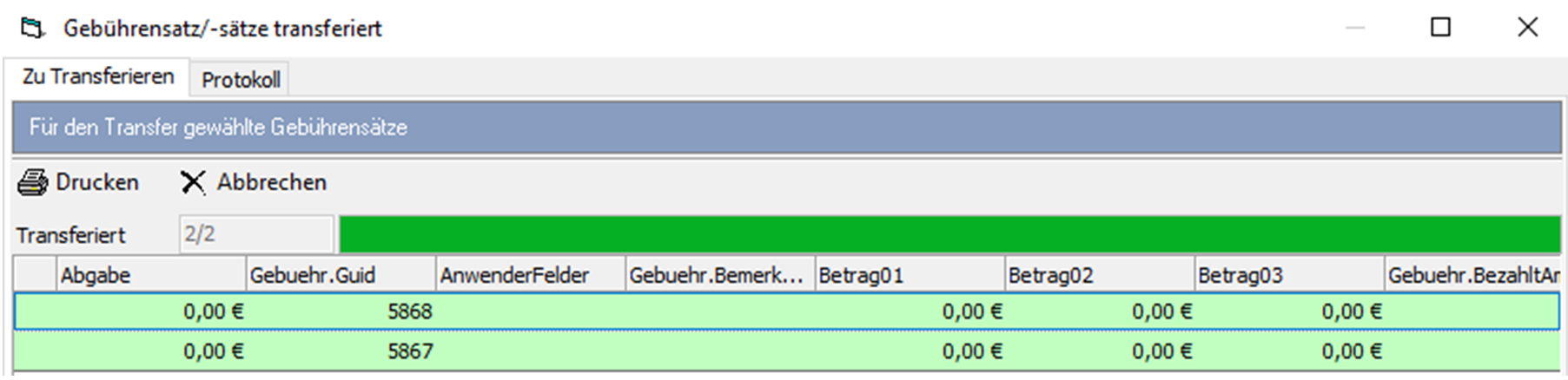 Wenn der Transfer abgeschlossen ist, sehen Sie folgendes Fenster. (alle Datensätze werden im Optimalfall mit grünen Hintergrund als erfolgreich transferiert dargestellt)