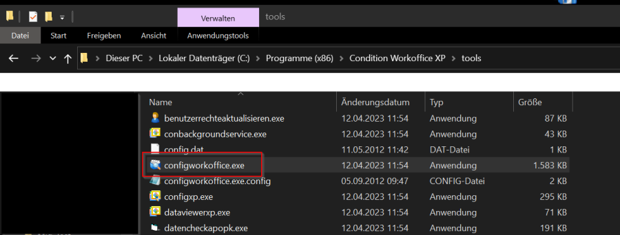 1. Öffnen Sie zunächst die "Workoffice Administration" Das "Admintool" finden Sie über das Windows-Startmenü, den WorkOffice-Schnellstartwürfel oder im WorkOffice-Installationsverzeichnis im Unterordner „Tools" bspw. "C:\Program Files (x86)\Condition Workoffice XP\tools\configworkoffice.exe"