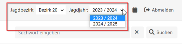 Im oberen rechten Bereich der Jagdstatistik befinden sich ein Drop-Down-Feld zur Auswahl des Jagdbezirks und ein Drop-Down-Feld zum verfügbaren Jagdjahr. Sind Sie in der Funktion als „Onlineverantwortlicher“ für mehr als ein Jagdbezirk zuständig, so können Sie über das Drop-Down-Feld zwischen den Bezirken wechseln. Ebenso kann über das Drop-Down-Feld zum Jagdjahr auch selbiges umgestellt werden.