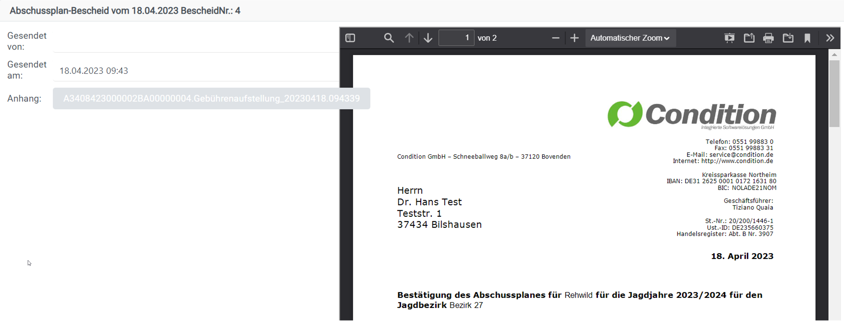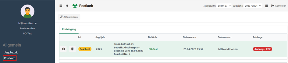 Um die Kommunikation in Zukunft über digitale Kanäle zu lenken, wurde der Postkorb entwickelt. Dieser soll die Verwaltung und Sichtung der eingehenden Nachrichten der Behörde, wie z. B. dem Abschussplanbescheid erleichtern. Sendet die zuständige Behörde ein Dokument an Ihren Postkorb, so wird eine E-Mail an den Onlineverantwortlichen ausgelöst, welche darauf hinweist, dass ein neues Dokument im Postkorb eingegangen ist.