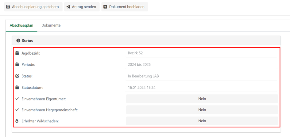 Im Bereich „Status“ sieht man die Grunddaten zum Abschussplan. Ebenfalls werden hier die Eingaben zum „Einvernehmen Eigentümer“, „Einvernehmen Hegegemeinschaft“ und zum „Wildschaden“ getätigt.