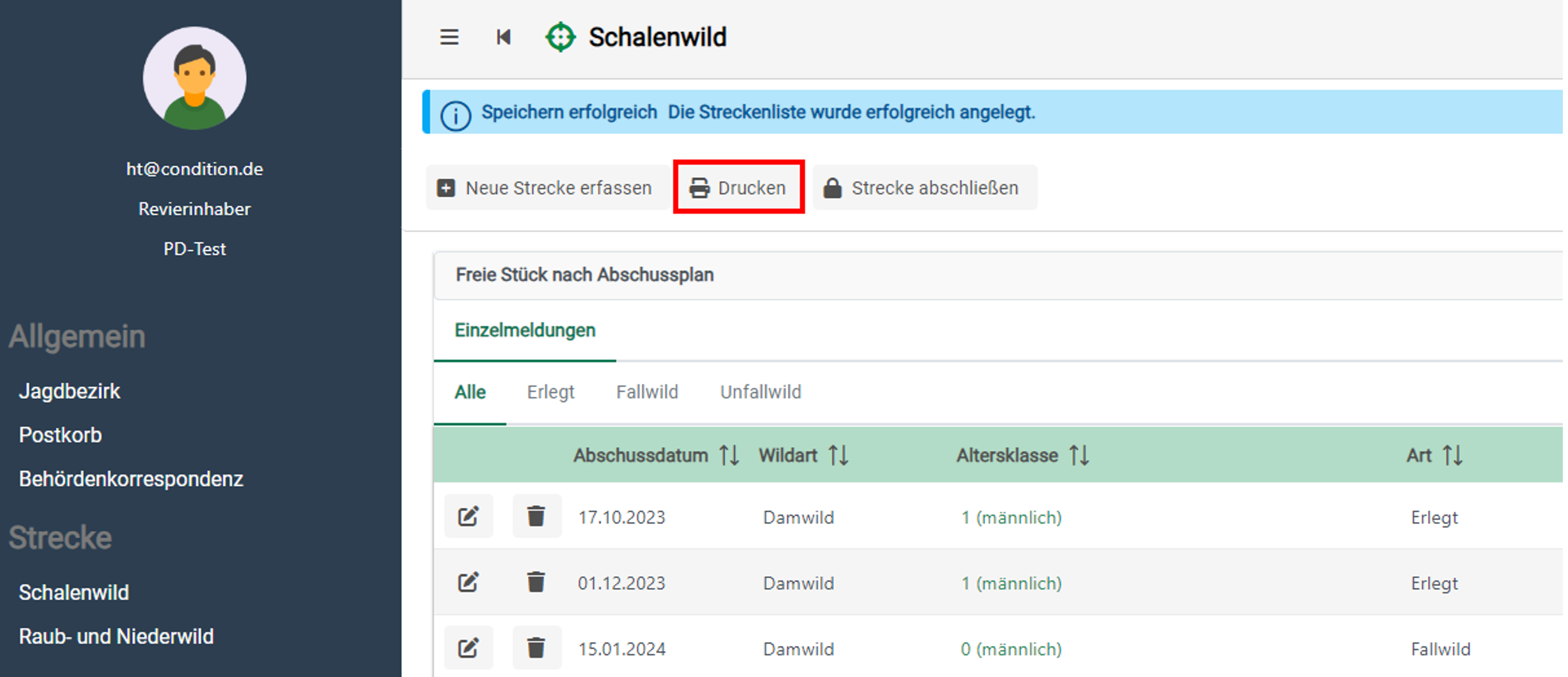 Die "Strecke Schalenwild" und die "Strecke Raub- und Niederwild" müssen separat gedruckt werden.