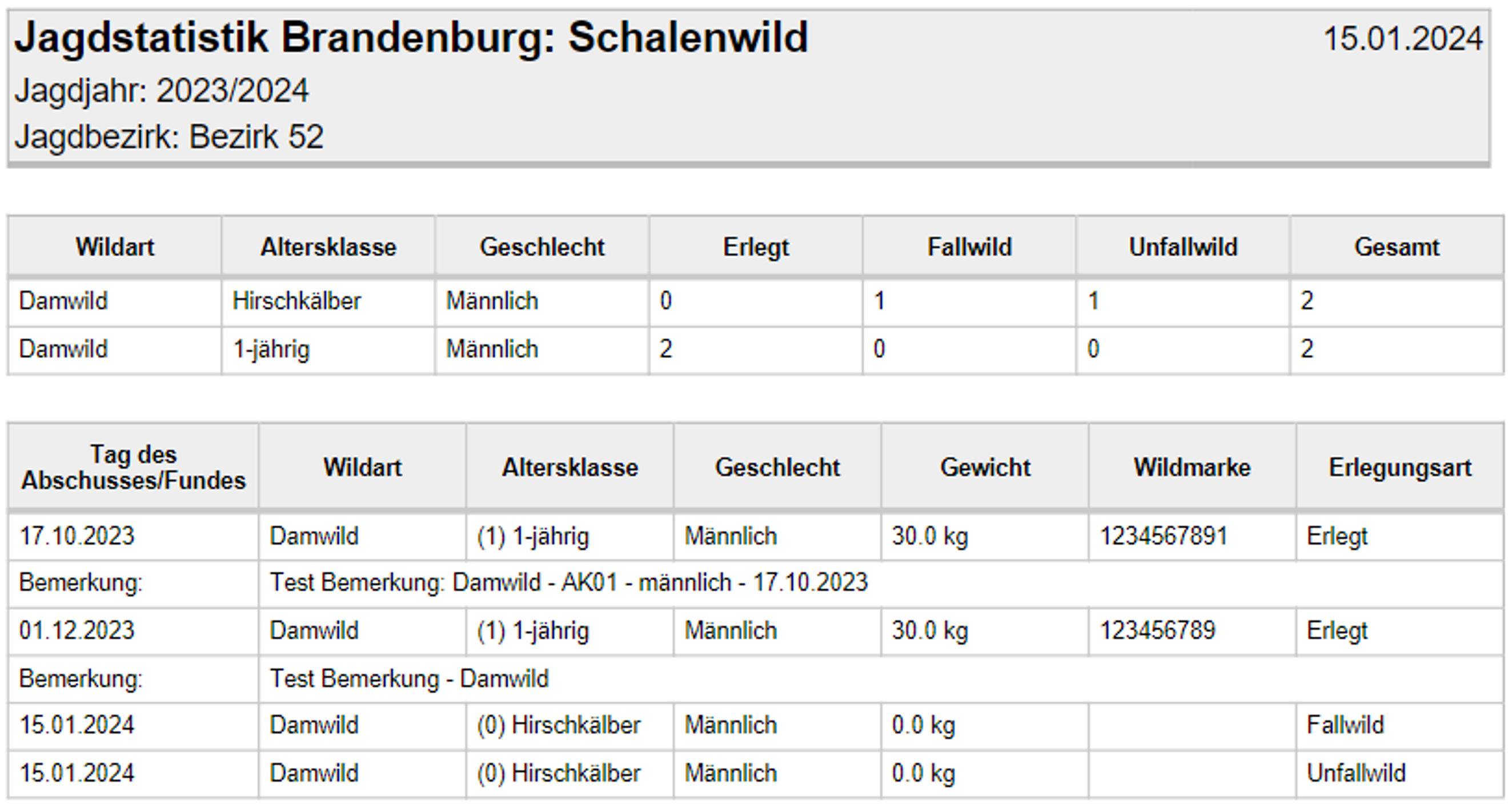 Der Druck ist in zwei Tabellen gegliedert. Im oberen Abschnitt finden Sie eine Tabelle der Strecke, in welcher die einzelnen Altersklassen zusammengerechnet sind. Im unteren Bereich werden die Einzelabschüsse und Funde mit dem Datum als Einzelmeldung aufgelistet.
