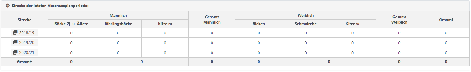 In der Tabelle "Strecke der letzten Abschussplanperiode" werden die Streckenzahlen der letzten Abschussplanperiode angezeigt. Mit einem Klick auf die links befindliche Jahreszahl, lässt sich die Strecke als Vorschlag übernehmen.
