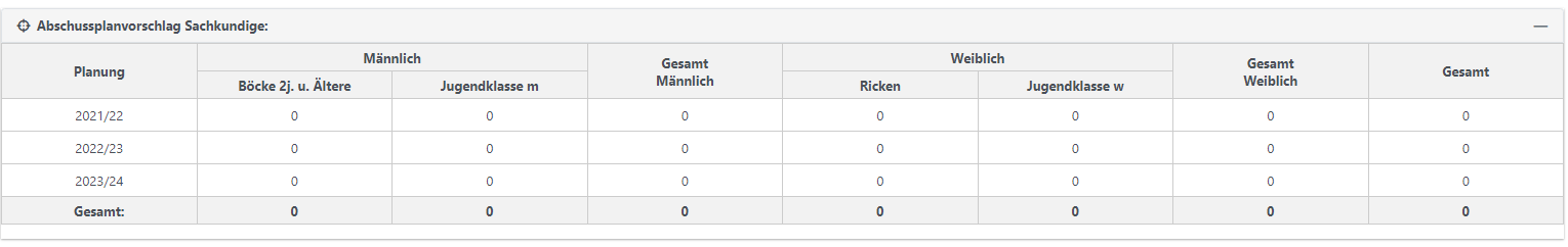 In der Tabelle "Abschussplanvorschlag Sachkundige" trägt der Sachkundige die Zahlen seines Vorschlags ein.