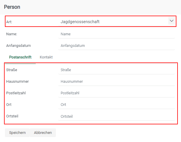 Um eine Jagdgenossenschaft anzulegen, wählen Sie die Personenart „Jagdgenossenschaft“ aus.