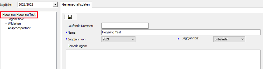Nach dem ersten Speichern können die Gemeinschaftsdaten durch markieren des oberen Bereichs der links befindlichen Baumstruktur angepasst werden.