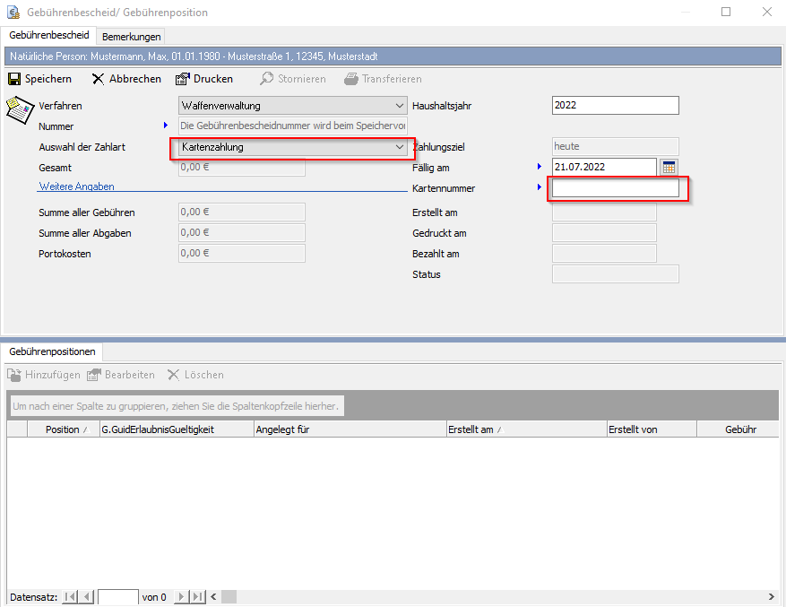 - Um einen Transfer an den den Kassenautomat zu veranlassen, muss zunächst ein Gebührenbescheid mit der Zahlart "Kartenzahlung" erstellt werden. Dadurch erscheint ein neues Pflichtfeld "Kartennummer", in dem die Kartennummer eingetragen werden muss von der Kassenkarte, welche Sie dem Bürger zur Zahlung aushändigen werden.