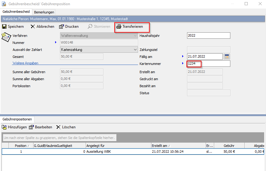 Nachdem der Gebührenbescheid vollständig mit entsprechender Kartennummer und den Gebührentatbeständen angelegt wurde, betätigen Sie oben rechts im Anschluss den Button "Transferieren".