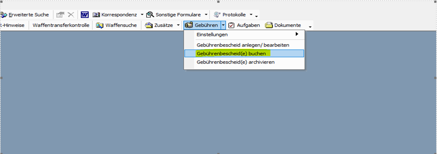 • Öffnen Sie über den rechten kleinen Pfeil des Buttons „Gebühren“ im darauffolgenden Menü die Option „Gebührenbescheide buchen“ aus.