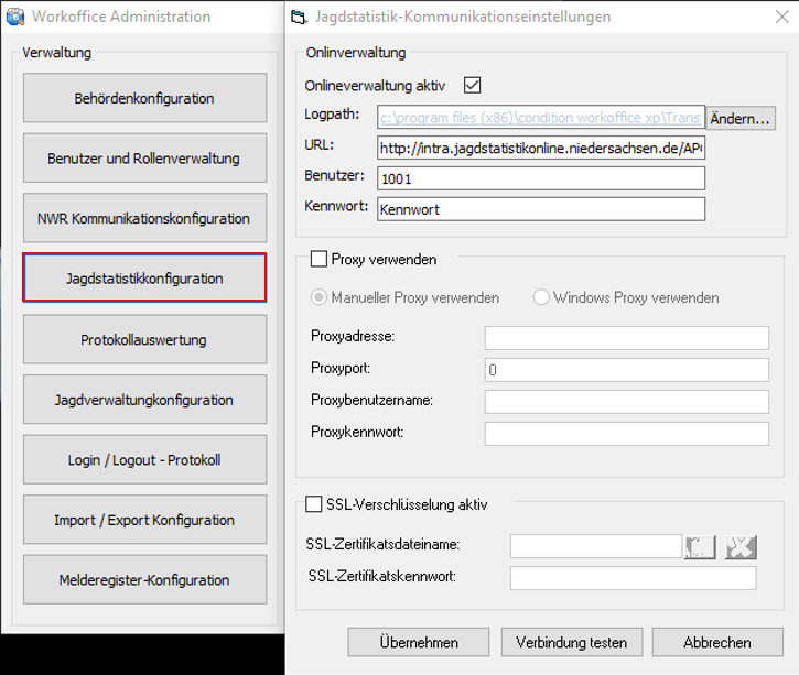 Klicken Sie auf die Schaltfläche [Übernehmen], um die eingetragenen Daten abzuspeichern. Führen Sie anschließend einen Verbindungstest zum Onlinesystem der Jagdstatistik durch. Klicken Sie dazu auf den im unteren Bereich der Maske befindlichen Button [Verbindung testen].