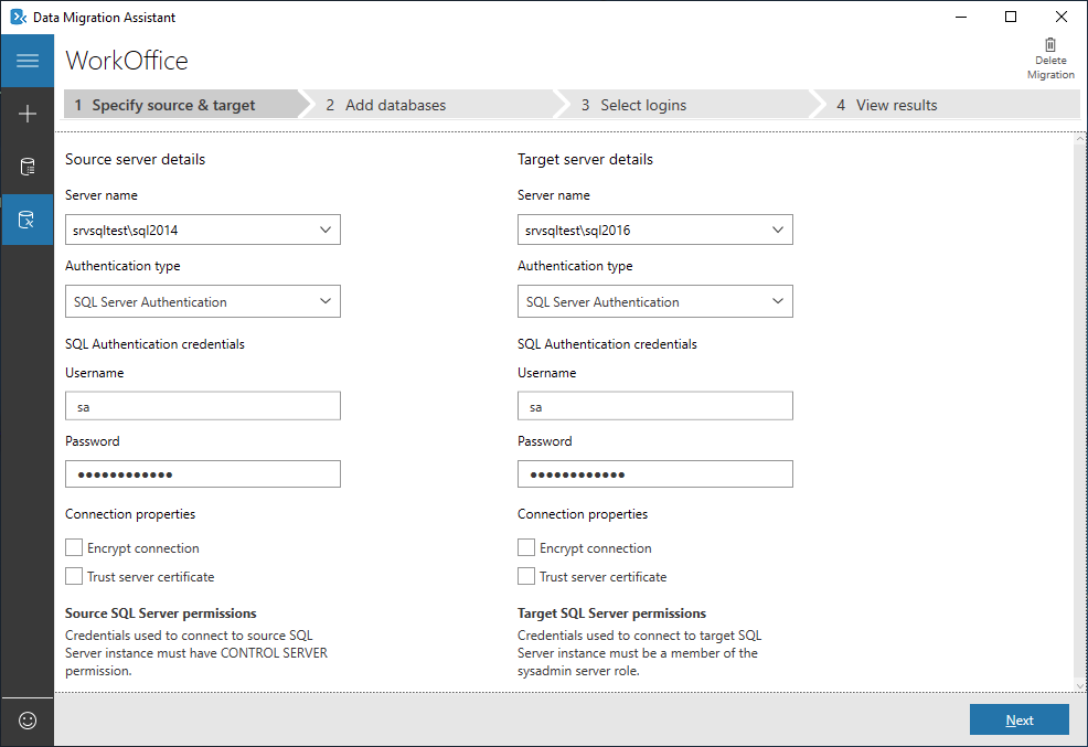 - Hinterlegen Sie die genauen Daten der Instanz des Quell-(Source) Servers sowie den Ziel-(Target) Server für den Migrationsvorgang. Verwenden Sie einen Windows- oder SQL Serverbenutzer mit ausreichenden Berechtigungen für die Anmeldung an den beiden Serverinstanzen - optimaler Weise ist das hierfür eingesetzte Konto der "sa"-Benutzer der SQL Server. Sofern keine SSL Zertifikate auf den Servern installiert wurden, entfernen Sie den Haken unter "Encrypt connection". Klicken Sie auf [Next] um fortzufahren.